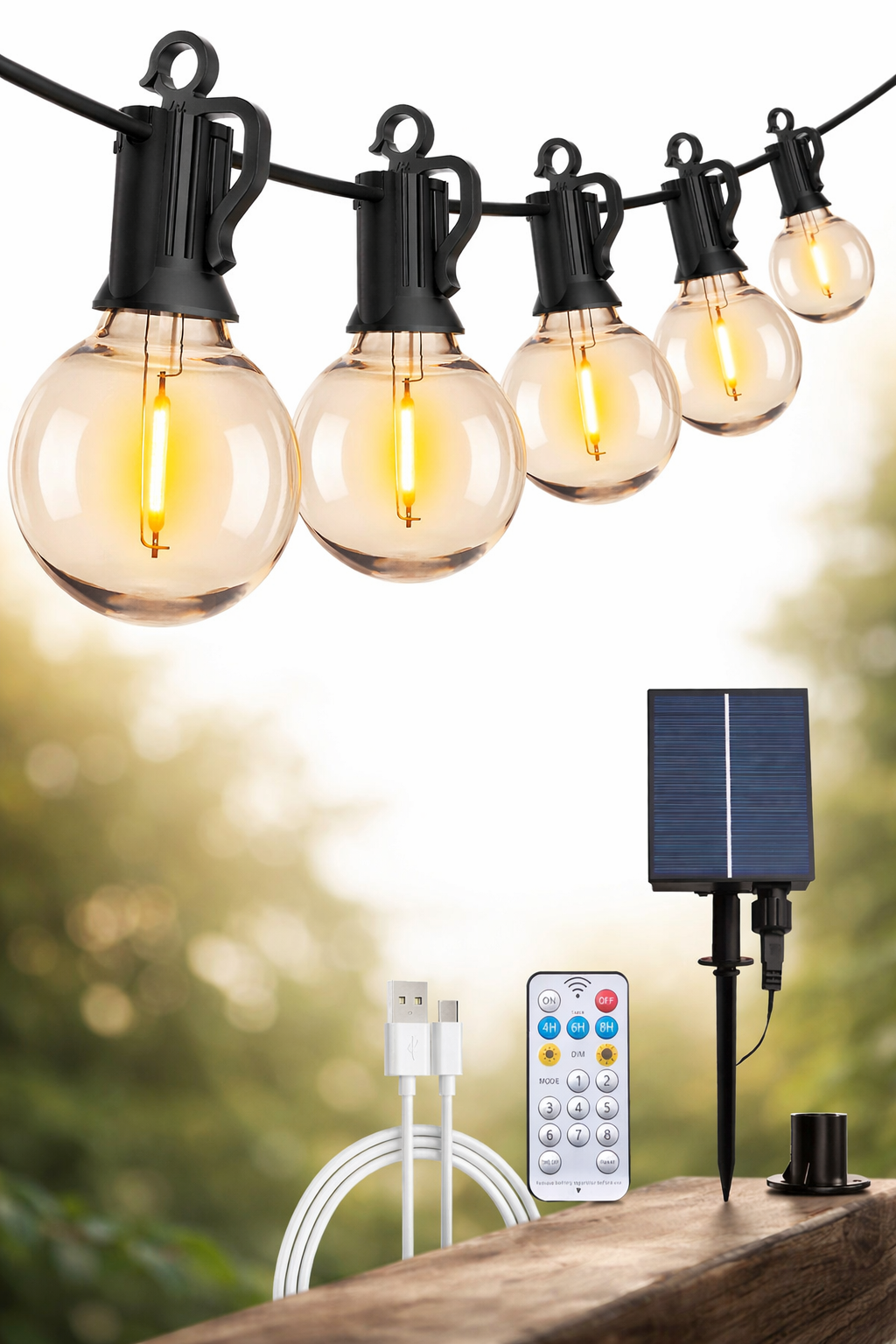 Guirnalda solar, luz cálida, 30 metros, panel solar, control remoto, cable usb para cargar.